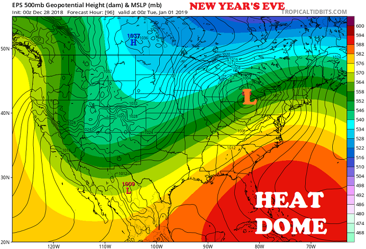 After the New Year’s Eve event, the heat dome will finally get squashed by the middle of next week. There may be a good lake-effect snow event the following weekend as strong Canadian Clippers roll through. But I don’t see that BIG DOG nor’easter type storm to kick us into high gear yet.