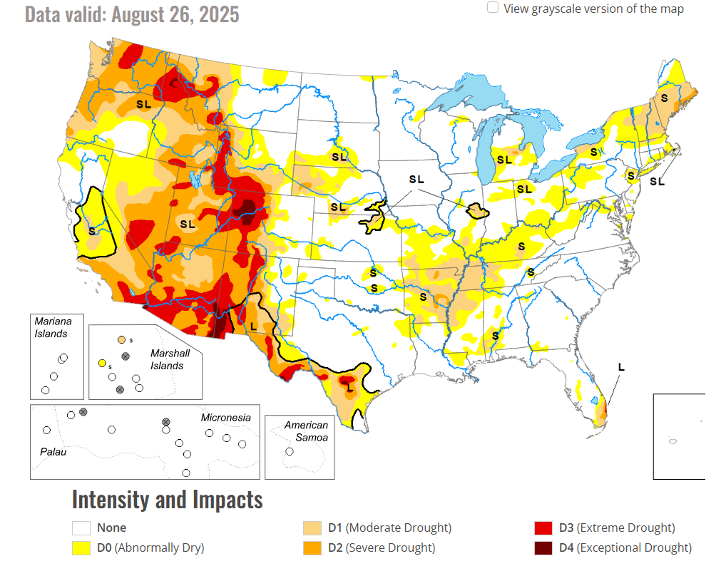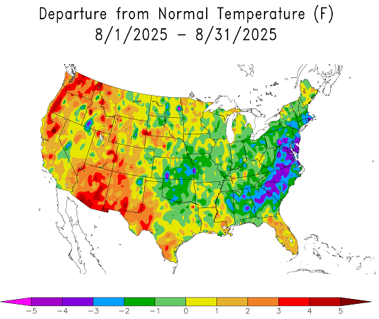 With severe to exceptional drought conditions through the Rocky Mountain states, the warm maximum may be further west into that region this year. With developing drought in the northeast, our temperatures may trend closer to climo or even a tad above.