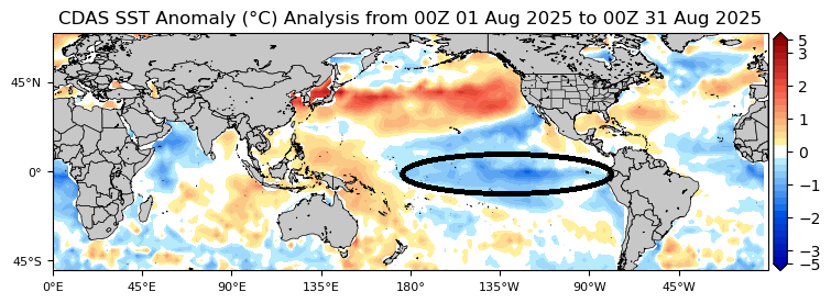 - Cold pool in equatorial Pacific extending from South America to international dateline.