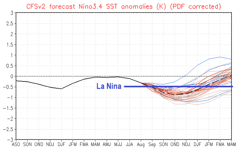 CFSv2 modeling is more aggressive with cooling, squarely indicating weak La Niña into autumn and winter.