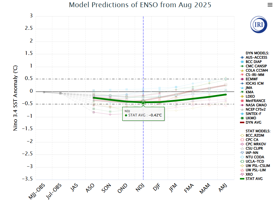 Statistical average of international modeling shows -0.42*C in Nino 3.4 region for November-December-January, just shy of the “magic” -0.5*C used to declare La Niña.
