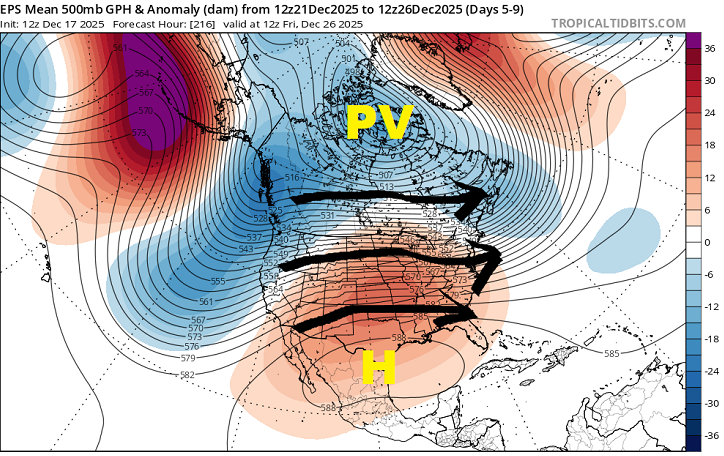 The constant parade of Canadian Clippers and Arctic cold shots is DONE for now. Next week, we’ll have a rapid zonal flow between strong Polar Vortex (PV) to the north and subtropical high (H) to the south.