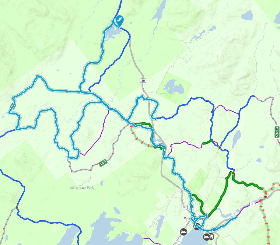 For the Speculator area: Perkins Clearing, Speculator Tree Farm and Powley Road are your best options. Narrow woods connector trails are mainly rough riding.