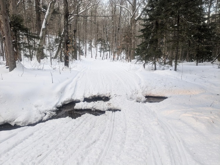 C8/Sabael trail was groomed for a mostly comfortable ride. There were a few water spots, with this one being the worst offender.