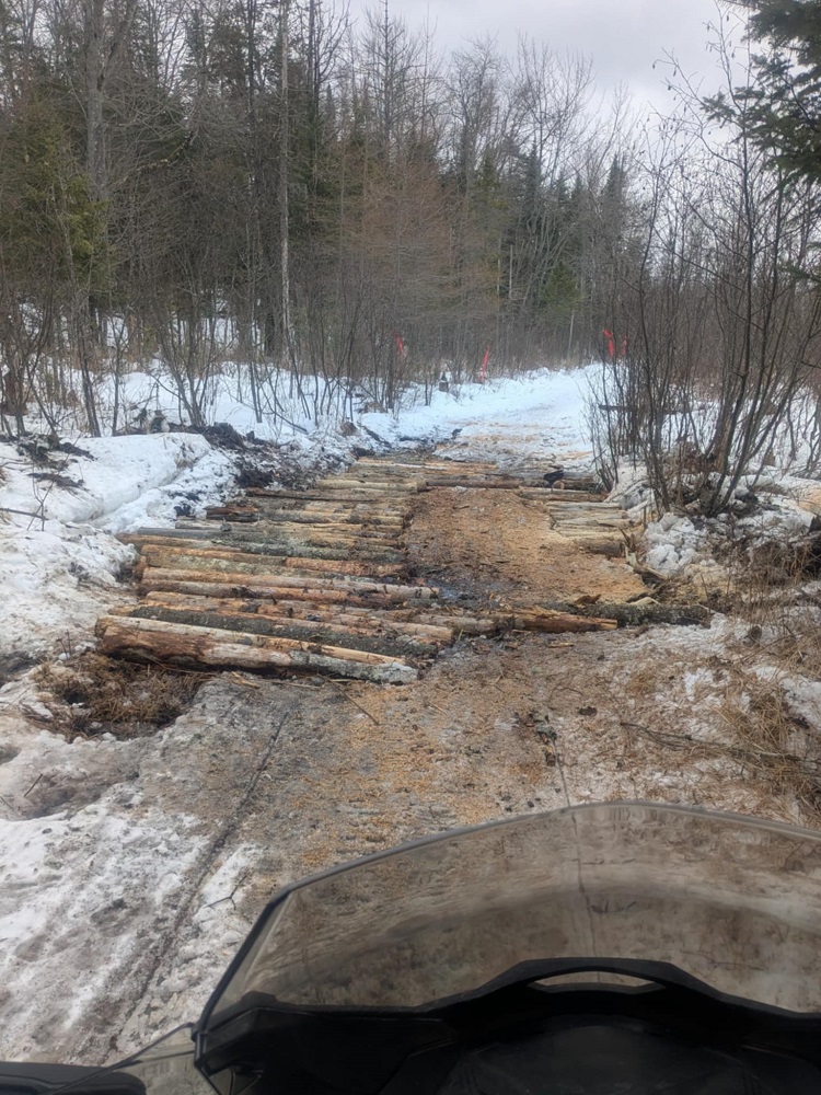 Town of Indian Lake crew had laid out corduroy over a flooded section of trail between Hami 603 intersection and Pashley Road.