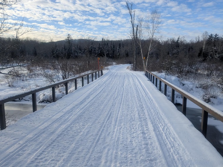 Indian Lake town trails hadn’t been groomed since yesterday’s new snow. But C8/Sabael trail wasn’t that bad, other than chuckholes eaten away by water. The log corduroy was holding up well.
