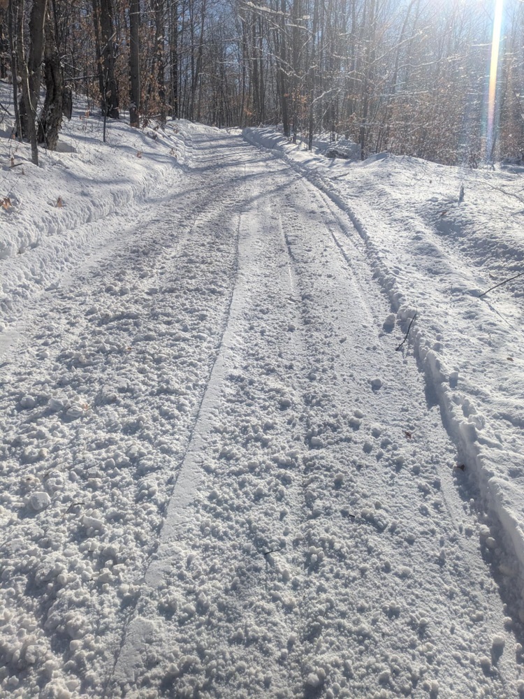 Fawn Lake Road had enough snow on the margins to get by. But it would be nice to have a shelved snowbank to keep us off the road. Strong sun dries that quick!