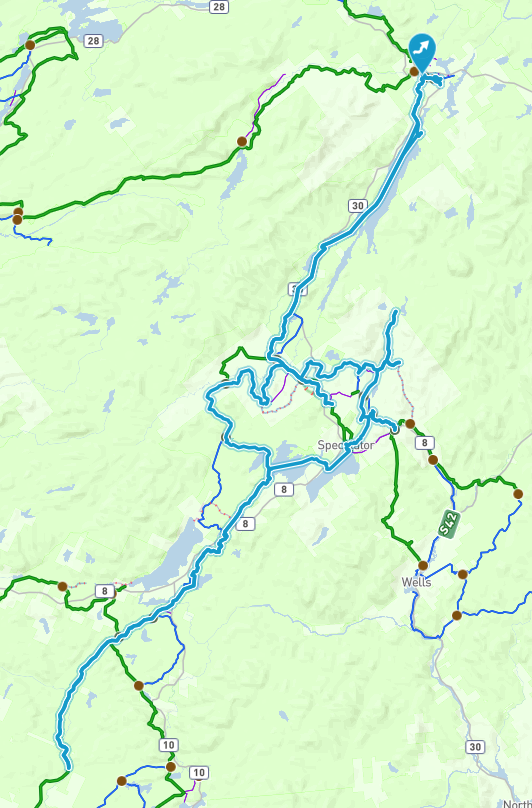Decided to hit up Speculator Tree Farm on the way back ilsnow Capital City, Indian Lake. Thin snow cover on Sacandaga Lake and Lake Pleasant, but just enough dusting for adequate cooling. LP1/Page Street trail was snirty in places, but groomed for a pretty good ride. Speculator village trails were hard and icy – ranging from nearly smooth to studder bumps.