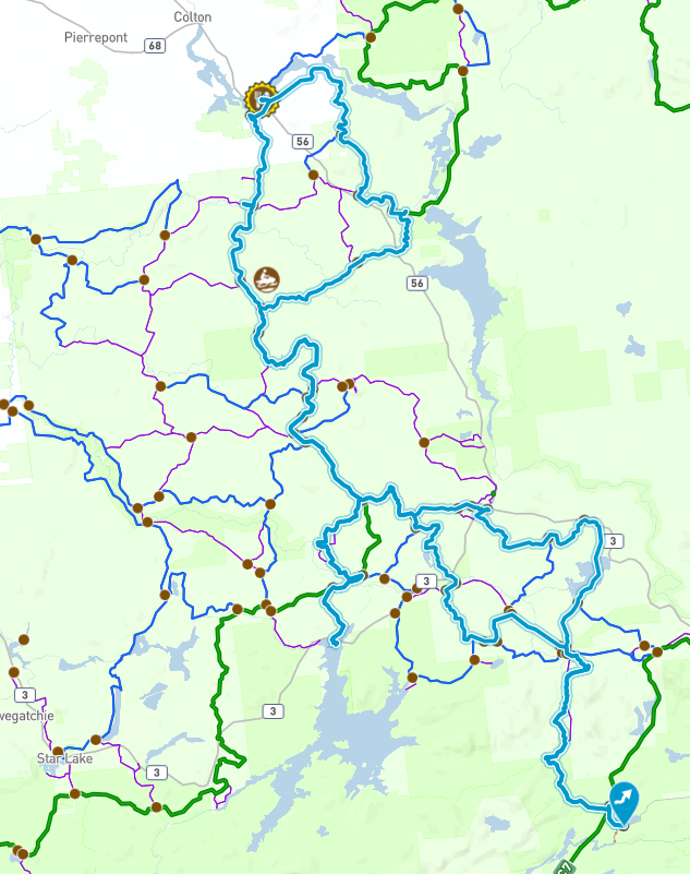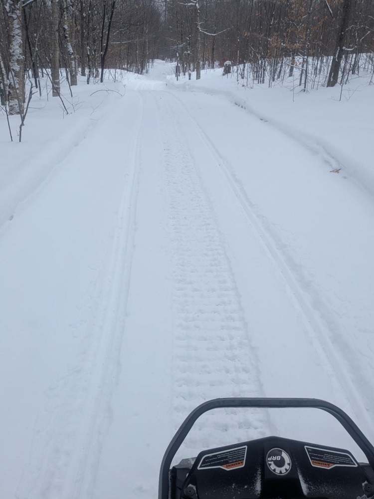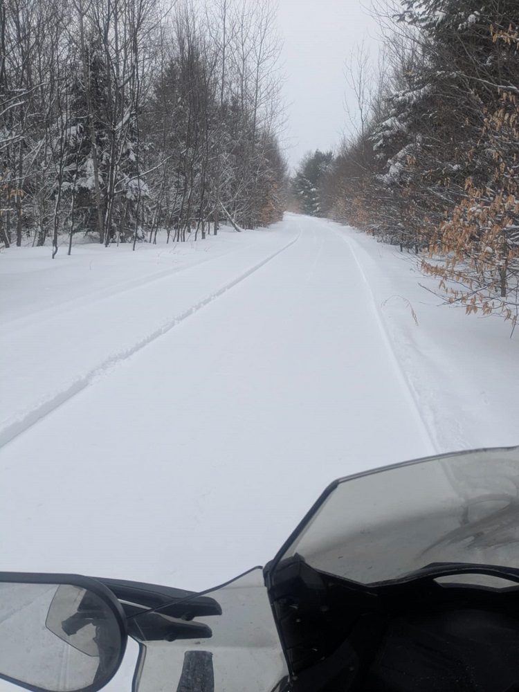 Rolled C8D to STLA 79 intersection. Then took S86A to South Colton. Lengthy plowed driveway section had a couple inches of new snow to grease the skids nicely. Other than a few water/washout hazards, it was a nice meandering ride through the woods. Laid first track on that!