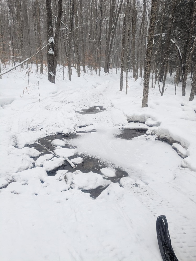 C4/Fish Mountain to Oxbow trail was groomed. Got thin and pebbly for stretches between cemetery and Oxbow Lake. But many of the water hazards have frozen over.