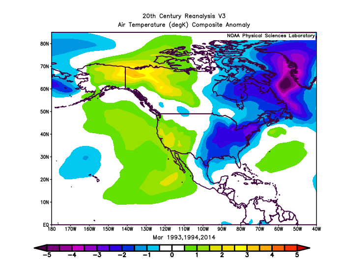 I don’t expect maxed-out March Madness like we had in 1993, 1994 or 2014. Temperature anomaly composite for those three years as follows: