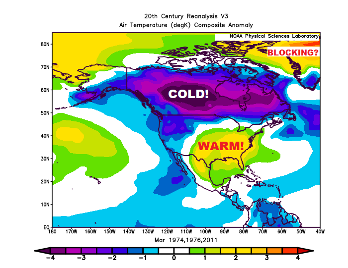Composite precipitation anomaly for March 1974, 1976 and 2011 show a precipitation-rich signature from Great Lakes region into northeast USA.