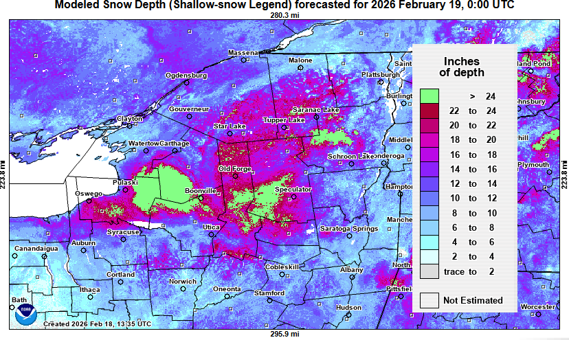 Modeled snow depth estimate is robust in the heart of Adirondacks and some surrounding foothills. Nothing close to record depths, but at least 1-2 FEET region wide & up to 3 FEET or more in the snow bowls.