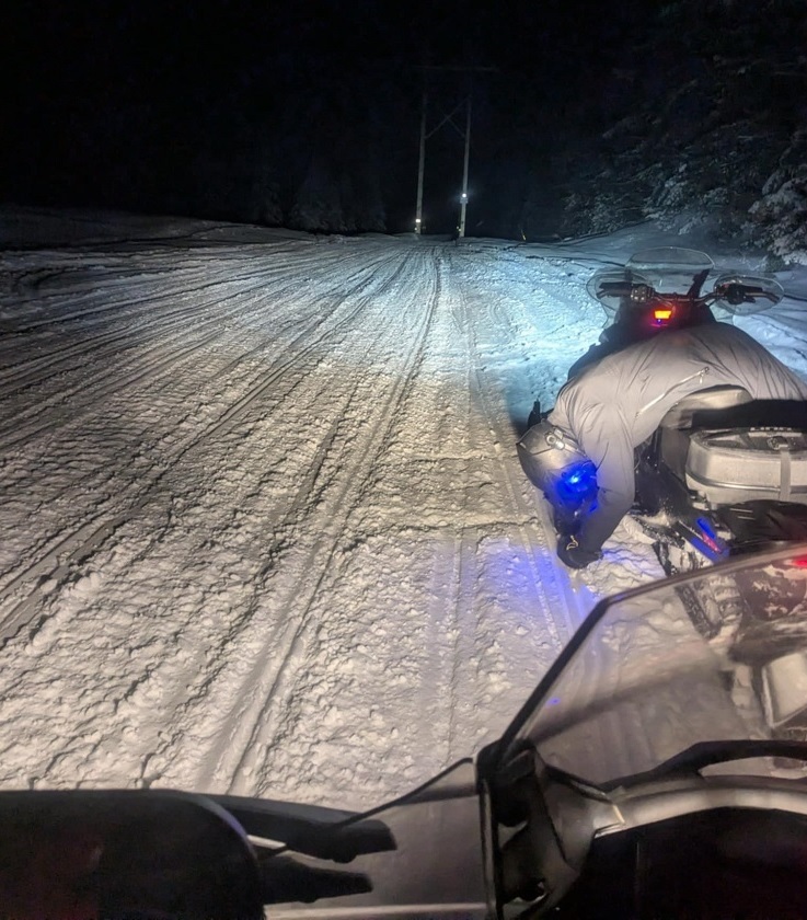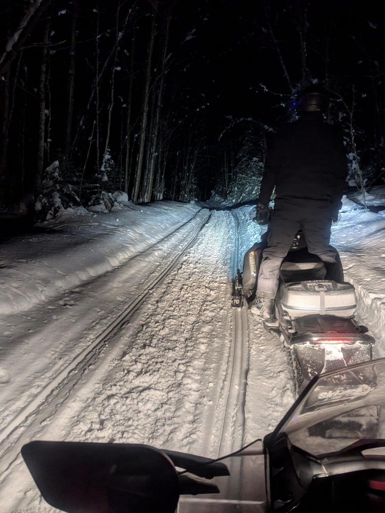 Caught a recent groom approaching Rainbow Lake and rode that sweet relief into Gabriels. While taking a break on the smooth section, Darrin Jr keeled over his snowmobile to stretch his back after the pounding we took to get there.