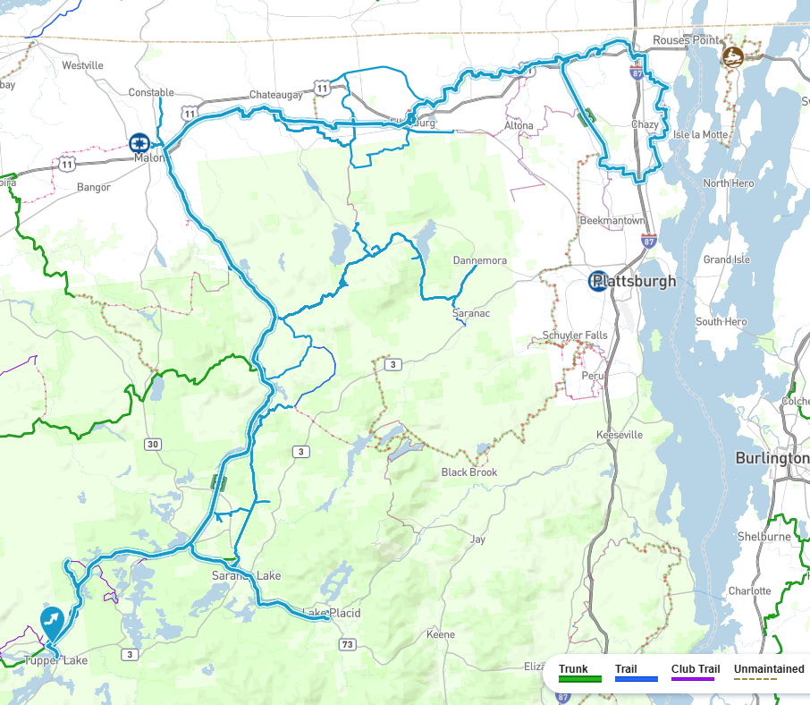 By the time we reached Charlies Inn with 242 miles for Sunday, I had gathered my second wind or maybe my third. I determined that rolling C7B to Lake Placid then hitting up Local 864/Floodwood trail would leave us just shy of 300 miles upon re-arrival at Washington Street parking lot. Then a jaunt on Local 871/Junction pass trail to the Golden Arches would nudge our tally over the top.