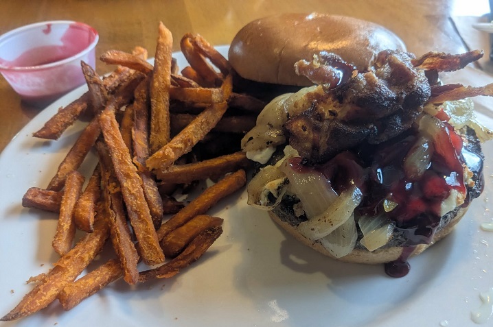 After that crew headed back out to finish their ride, I ordered a blackened bacon blue burger and side of sweet potato fries. Good eats on a cold day!