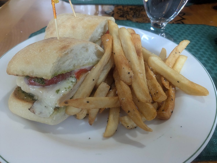 Started with Manhattan clam chowder. Main fare was Mediterranean Provincial sandwich – Grilled Chicken, Roasted Red Peppers, Basil Pesto, Provolone, Ciabatta Roll. Hit the spot nicely!