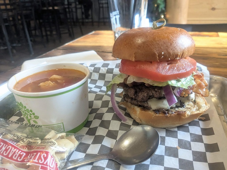 Chicken and veggie soup and triple patty smash burger with all the toppings. Then banana cream cheesecake for dessert. I eat “good for me food” nearly 90 percent of the time. On the trail, I eat for FUN.